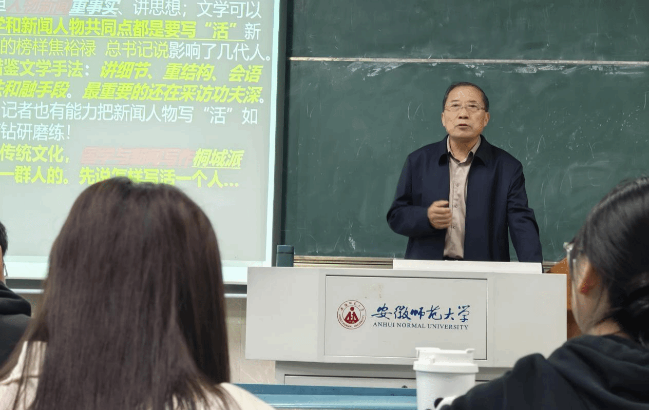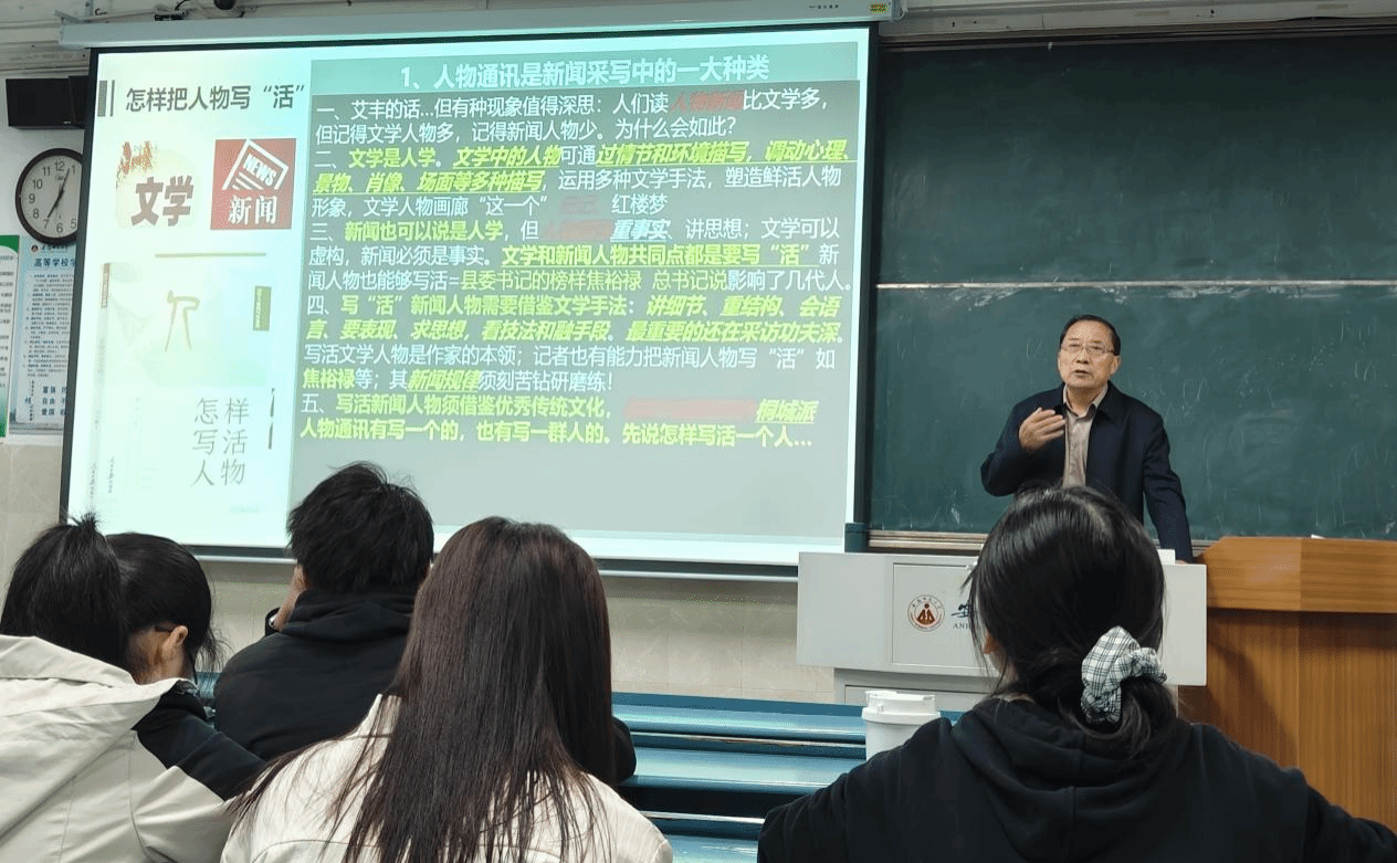 近日,我校特聘教授、人民日报安徽分社原社长、高级记者刘杰在行知楼2010201教室,为2023级新闻专业的同学们带来了一场主题为“国学与新闻学研究、怎样把人物写‘活’”的精彩讲座。此次讲座由新闻学主任张荻主持,2023级新闻学专业全体同学到场聆听学习。