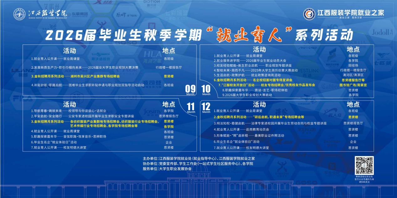 10月31日至11月4日,学校联合中国服装人才网举办“纺织服装产业链专场网络招聘会”。江苏沭宁美居科技股份有限公司、福州融裕行纺织织造有限公司、浙江屹男集团等多家知名企业参与,聚焦行业转型趋势,集中发布数字化专员、智能AI工程师、精益管培生等一批新兴智能岗位,打造“互联网+就业+新智能岗位”精准对接平台,有效拓展毕业生就业选择空间。