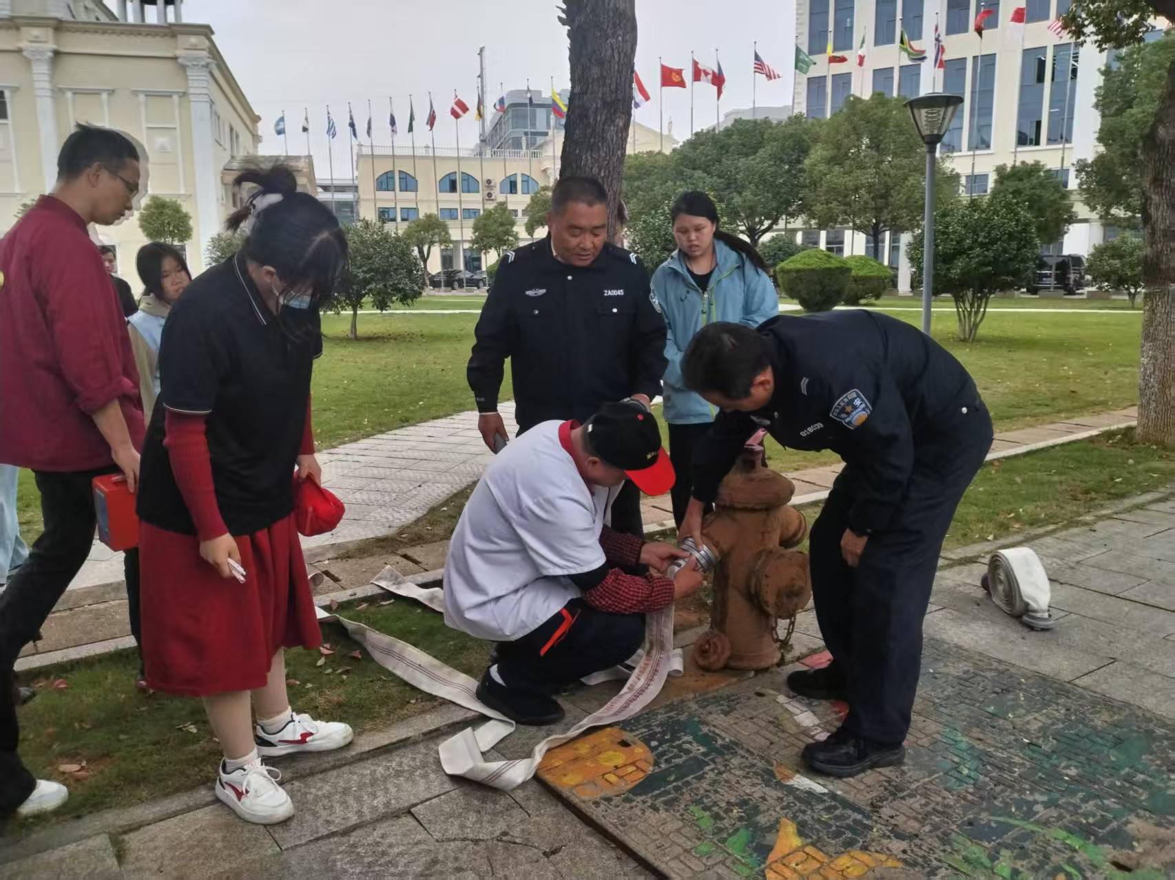 理论培训结束后,沉浸式消防安全实训在霓裳宫前广场接续展开。在校保卫处老师的专业指导下,教职工与普法协会成员有序投入灭火器实操、消防栓操作等实战科目。