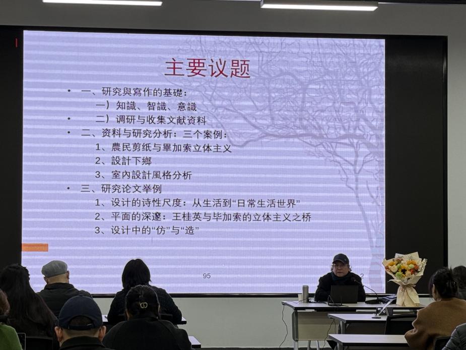 在资料与研究分析方面,李砚祖教授以“王桂英剪纸、设计下乡、维也纳老年人公寓室内设计风格”三个案例为切入点,生动地分析了艺术设计中的文化性。他强调无论是申报课题还是论文写作,不能全靠文献检索,还要作一定的田野调查,收集一手资料作支撑。此外,他还以“设计中的‘仿’与‘造’”为例,细致地讲解了论文写作的层次结构和逻辑架构,在写学术论文时,要时刻带着问题意识,围绕主题进行论述。
